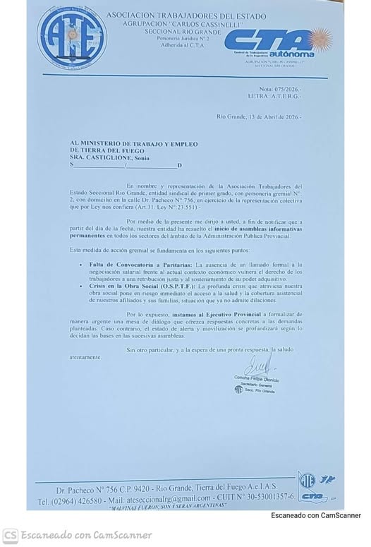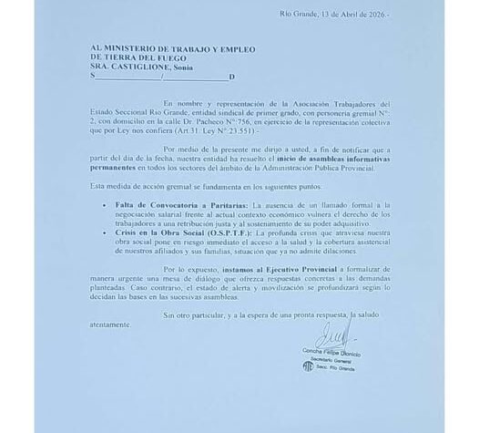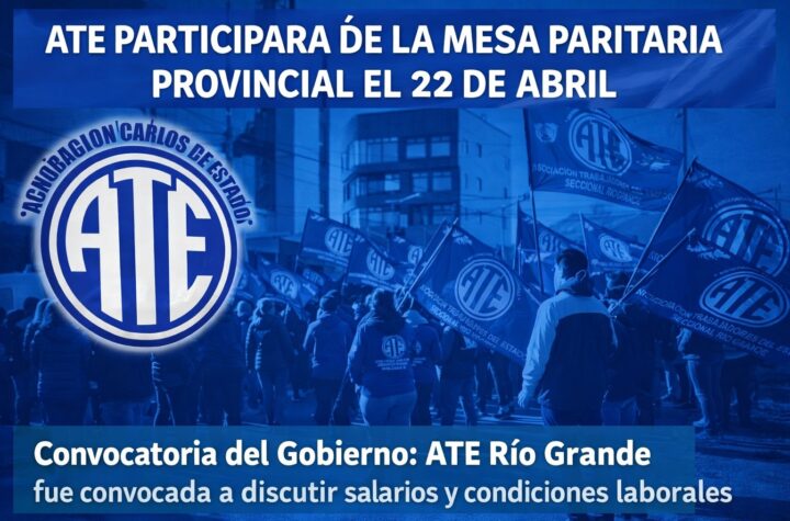 La Asociación Trabajadores del Estado (ATE) Seccional Río Grande, bajo la conducción del Secretario General Felipe CONCHA, comunica a todas...